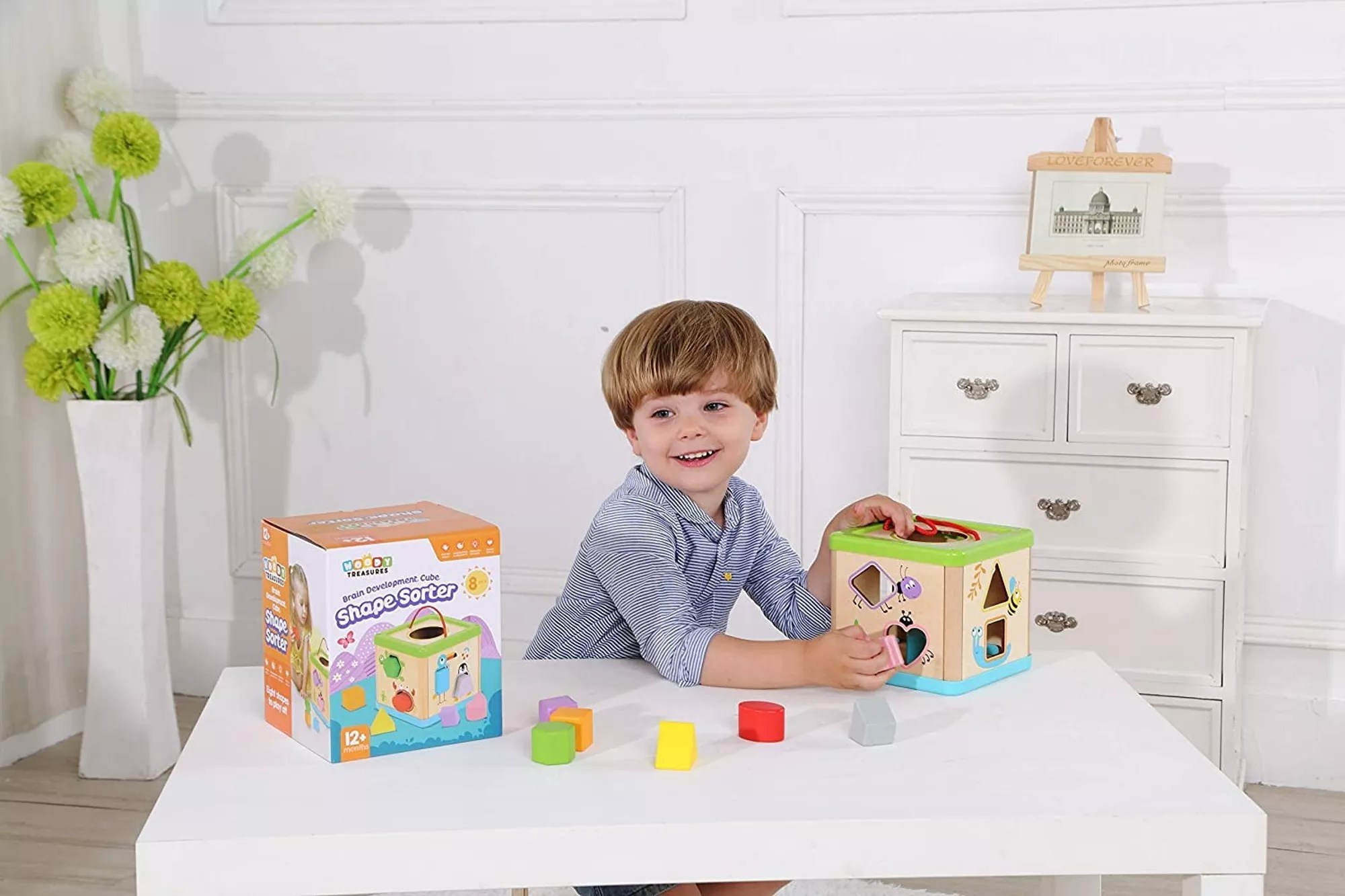 The Shape Sorter Activity Cube is a wooden toy designed for children as young as one year old, combining fun and learning by helping develop fine motor skills and hand-eye coordination through shape recognition, vibrant colors, and interactive play.